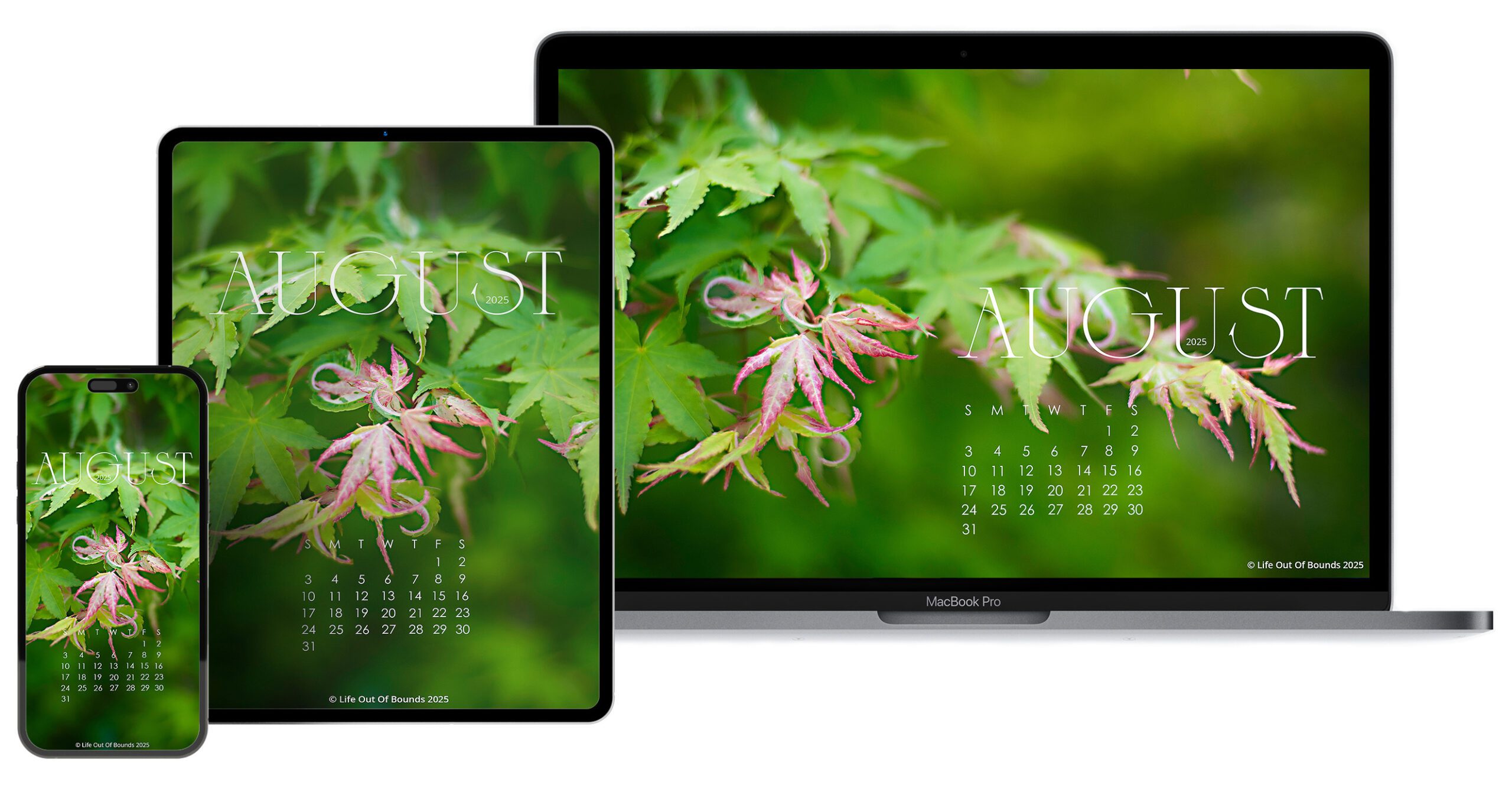 August 2025 free calendar wallpaper for laptop/desktop, iPad/tablet, and iPhone/smartphone featuring a young maple tree in the summer garden