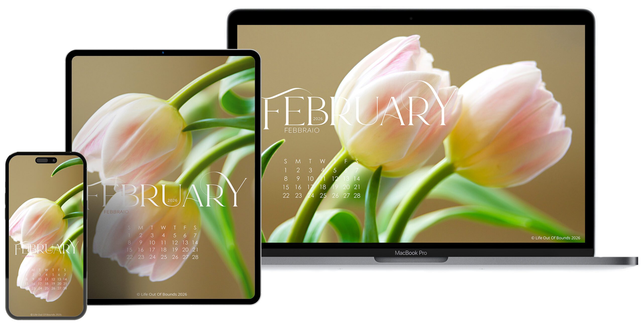 February 2026 free calendar wallpaper for laptop & desktop, iPad & tablet, iPhone & smartphone featuring pale pink tulips